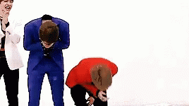 Kpop Oppas in colorful suits laugh and bow deeply, showing respect and humor.