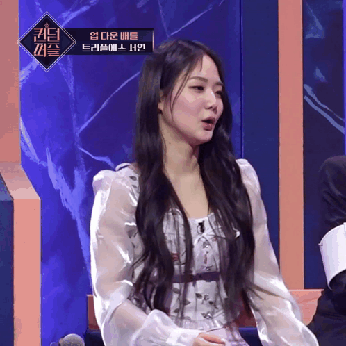 tripleS Seoyeon's surprised and then smiling reaction during the Up-Down Battle on Queendom Puzzle.