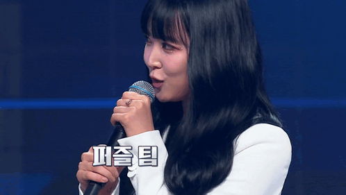 Shiroma Miru sings 'No-No~' with the Puzzle Team in Kpop Queendom Puzzle, holding a microphone.