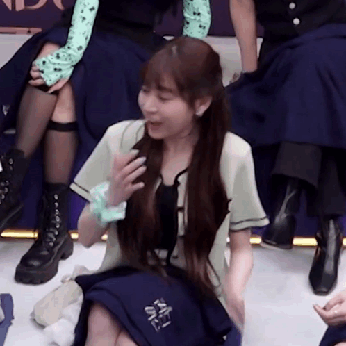Bora from Cherry Bullet smiles and gestures during Kpop Queendom Puzzle, sitting on the floor.