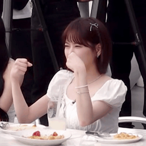 Bora from Cherry Bullet makes a funny face while sitting at a table with food during Queendom Puzzle.