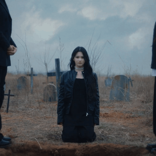 a woman in a black jacket is kneeling in a field of graves