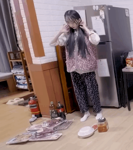 a woman standing in front of a fridge that has a sticker on it that says ' lg ' on it