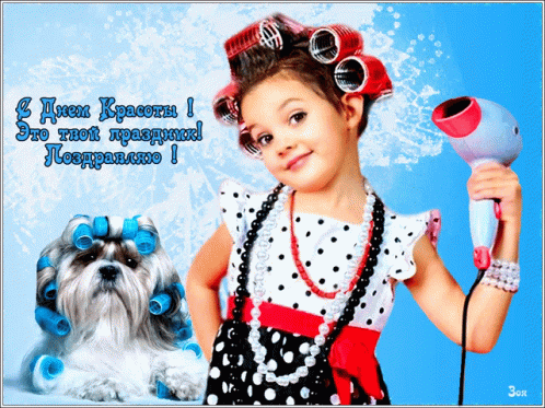 A little girl with curlers and a hairdryer, alongside a dog also in curlers, celebrating Beauty Day.