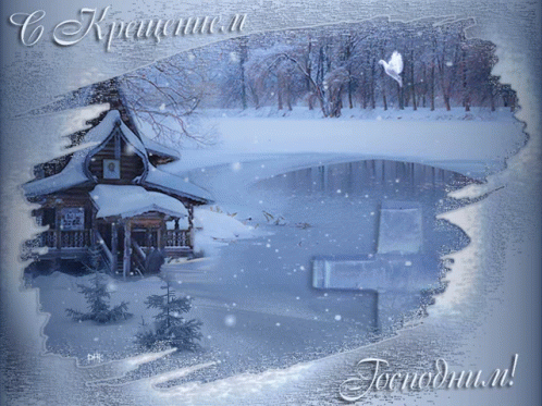 A snowy winter scene with a traditional wooden house and an ice cross, celebrating Epiphany.