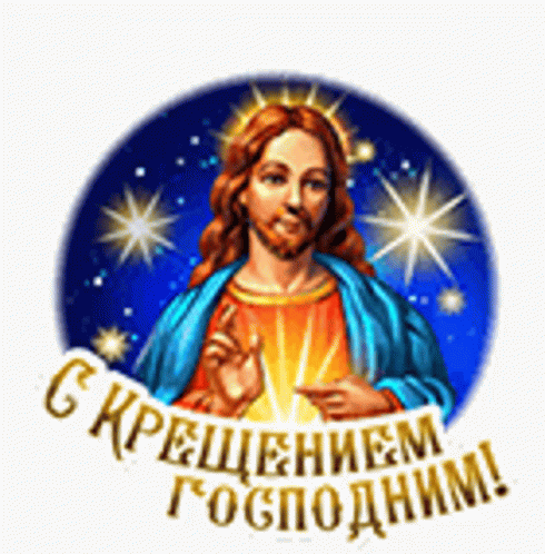 a picture of jesus in a blue robe with the words " с крещением господним " below him