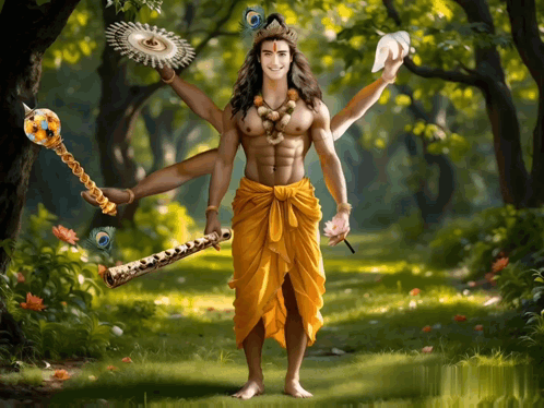 An artistic depiction of Lord Krishna, the Hindu deity, with multiple arms, holding a flute in a lush forest setting.
