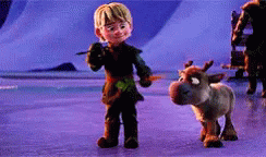 Young Kristoff from Disney's Frozen shares a carrot with his reindeer companion, Sven, in a snowy landscape.