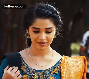 Actress Krithi Shetty, known as Bebamma from Uppena, smiles charmingly in a blue embroidered dress with gold jewelry.