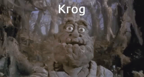Krog, the rock creature resembling Korg, looks shocked in a mystical forest setting.