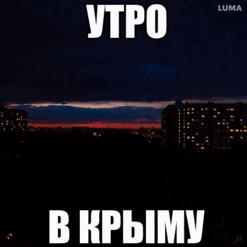 A beautiful dawn sky over a city in Crimea, with buildings silhouetted against the red horizon.