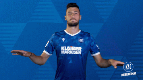 Lukas Fröde, a KSC Karlsruher SC player, makes a gesture in his blue team jersey.