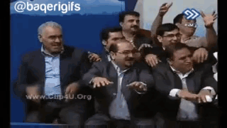 A group of men enthusiastically chant the Persian phrase "Come on, don't talk nonsense" on a TV show set.