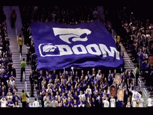 Fans at a Kstate Basketball game unfurl the large 'Octagon Of Doom' banner in the arena, showing team spirit.