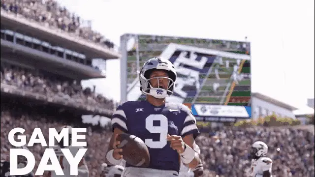 Kansas State football players in purple uniforms stand on the field, ready for action.