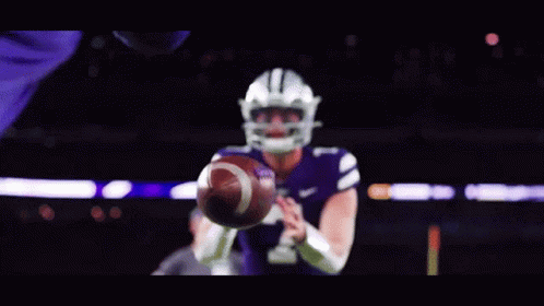 Kansas State quarterback Skylar Thompson throws a football during a game at NRG Stadium, showcasing his skills.