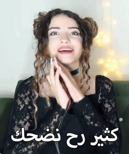 A smiling woman in a black lace top and choker, with Arabic text 'We will laugh a lot' on screen.