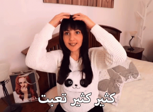 Woman in a panda sweater expresses feeling very tired, touching her head in a bedroom setting.
