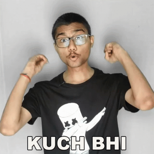 Sachin Saxena expresses 'Kuch Bhi' with a funny reaction, wearing glasses and a black Marshmello t-shirt.