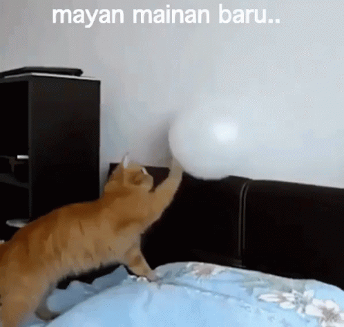 An adorable ginger cat plays with a white balloon on a bed, getting startled when the balloon suddenly pops.