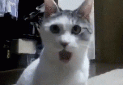 A white cat with wide eyes and an open mouth reacts with extreme surprise, as if saying 'Seriously!?'