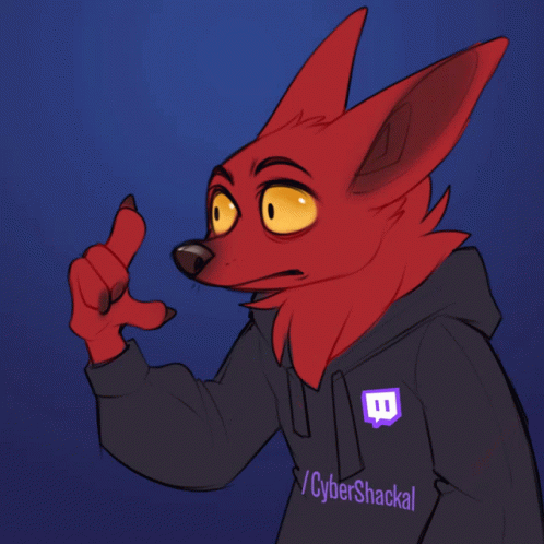 Animated red fox-like character Kyky (CyberShackal) making a thinking gesture while wearing a hoodie.