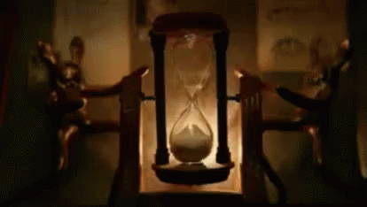 An hourglass with sand flowing, illuminated in a dim setting, creating a warm, antique atmosphere.