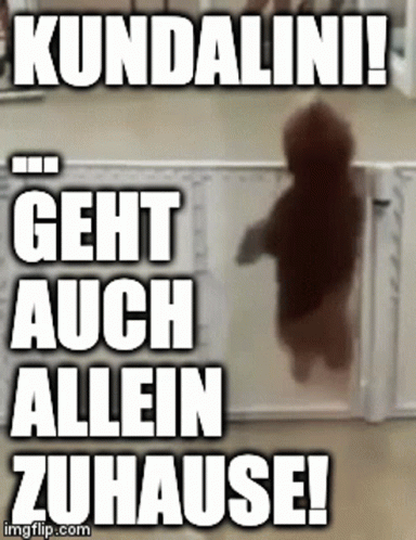 A small, blurry animal, possibly a dog, stands behind a gate with the text "Kundalini! Geht auch allein zu Hause!"