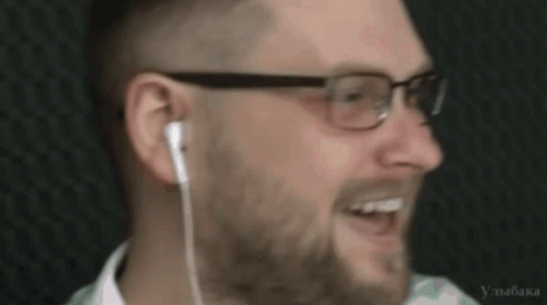 Kuplinov, wearing glasses and earbuds, smiles broadly, captured in a candid moment.