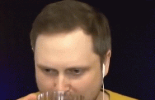 Kuplinov drinks from a glass while wearing earbuds, showing a focused expression.