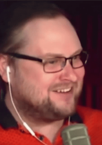 Kuplinov's sudden fright: A man in glasses and earbuds goes from laughing to a shocked expression.