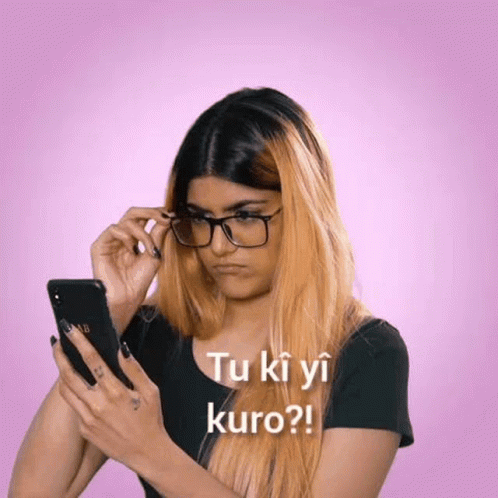 A woman wearing glasses looks confused at her phone displaying 'Tu kî yî kuro?!' (Who are you, boy?!).