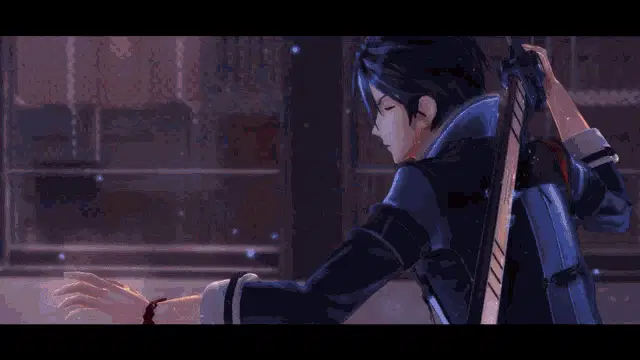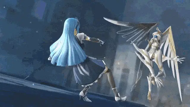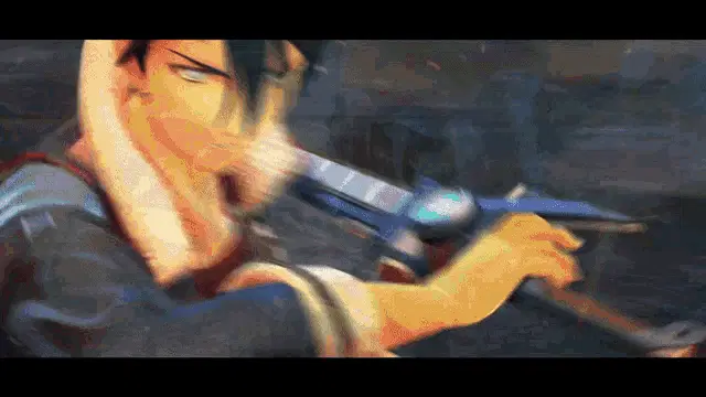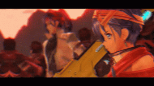 Feri Al Fayed from Kuro No Kiseki, a girl with blue hair, holding a distinctive yellow sword.