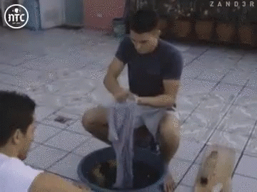 A man demonstrates traditional handwashing, known as 'Kusot Kula,' scrubbing clothes in a basin.
