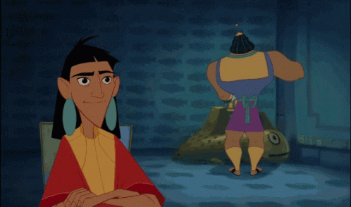Kuzco observes Kronk, who is surrounded by a red aura, looking surprised in a scene from the animated movie.