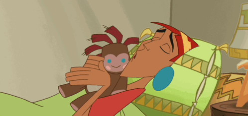 Kuzco from Emperor's New Groove peacefully sleeps, cuddling his stuffed monkey, Wompy.