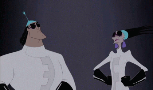 Yzma and Kronk share a high five, dressed in white lab coats and black gloves.