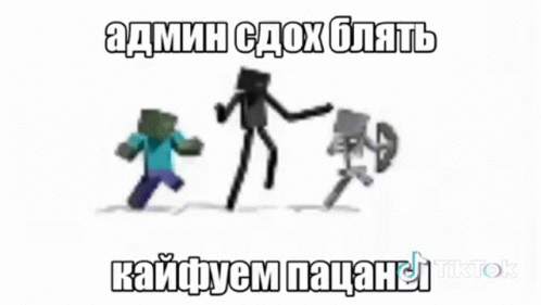 Minecraft characters (zombie, Enderman, skeleton) dancing, celebrating the admin's demise. Featuring Кузне Спиллер.