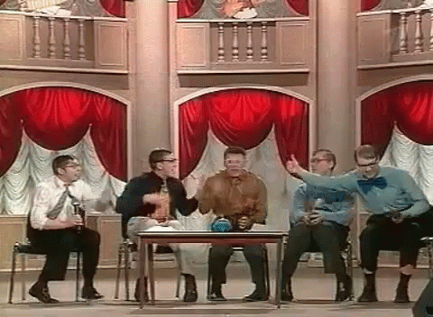 The KVN team Uralskiye Pelmeni performs on stage, with five men reacting animatedly around a table.