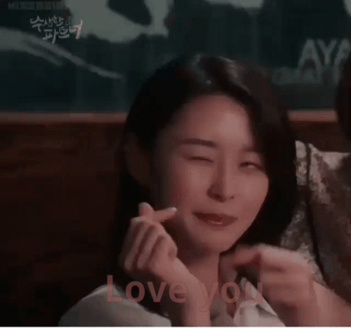 Kwon Nara winks and makes a finger heart gesture, with 'Love you' text overlaid, possibly with Kwon Ah Yon.