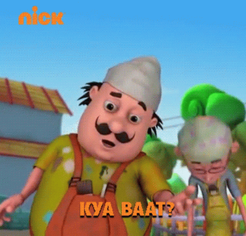 Motu and Patlu from the animated series react with the phrase 'Kya Baat?' in this colorful cartoon clip.