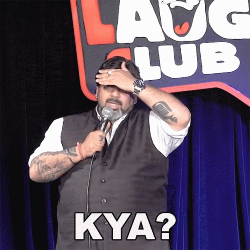 Comedian Jeeveshu Ahluwalia on stage, covering his face in a humorous reaction to 'Kya?'