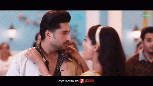 Sonam and a man share a romantic moment, looking into each other's eyes and touching faces intimately.