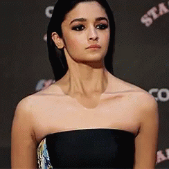 Alia Bhatt making a surprised and confused expression while standing in a black strapless dress.