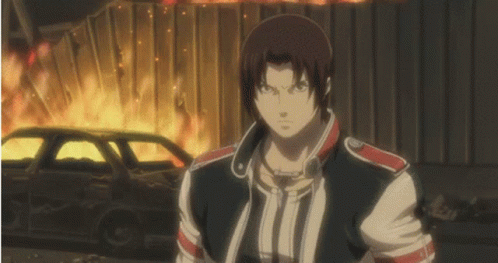 Kyo Kusanagi from King of Fighters stands ready for battle amidst a fiery backdrop.