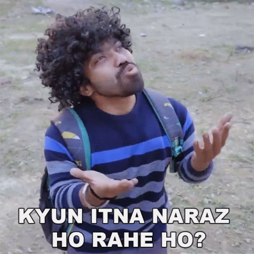 Vibhu Varshney asks "Why are you getting so upset?" with expressive gestures, wearing a striped shirt and backpack.