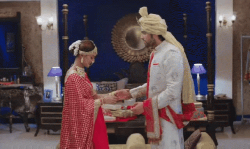 Erica Fernandes and Parth Samthaan as Prerna Sharma and Anurag Basu in traditional wedding attire, exchanging rings.