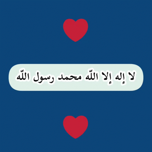 A blue background with two red hearts and the Arabic phrase 'There is no god but Allah, Muhammad is the messenger of Allah'.