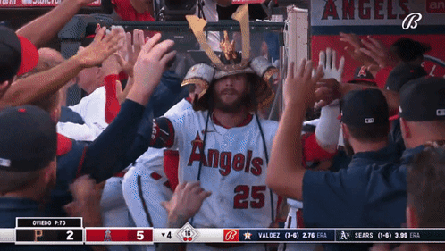 Trey Cabbage of the LA Angels celebrates with teammates, wearing a samurai helmet after a play.