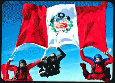 Skydivers proudly display the large flag of Peru against a bright blue sky.